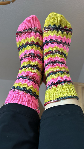 Zottie ist ein Fantasiewesen, welches für unsere Farbgeschichte im Februar 2022 Pate stand. Zusammen mit der Färbung „Lichtergarten“ strickte ich dieses Streifenmuster mit kleinen Zacken, die das Zottelfell Zotties nachahmten. Seither hatte ich die Idee diese Zottelstreifen für ein Paar Socken zu verwenden. So waren die Zottie-Socken geboren.