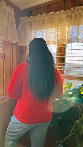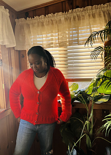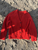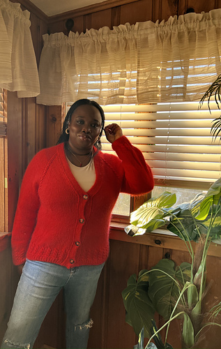 The red Zuri cardigan is knitted in Onling No 3 in Tomato and Onling No 10 in Bright Orange.