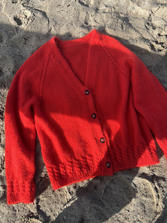 The Zuri cardigan is a top-down V-neck raglan cardigan with simple cable details in the yoke and ribbing. First, stitches are cast on for the back and shaped with German short rows. Raglan increases and V neck increases are worked to shape the yoke, while working cables in the raglan at the same time. After splitting for sleeves, the body is worked back and forth in stockinette stitch. The sleeves stitches are knit in the round on shorter circular needles or double pointed needles and the button band is worked in double knitting.