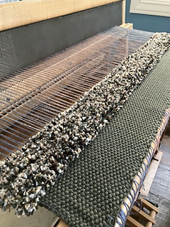Finished the first rug. I used the batch of chenille that was more neutral and ran out about 8” short of the planned 60”. the second rug will be with the second set of Chenille that has the red and bright green in it. I have warp for a third rug, but it looks like I’ll run out of chenille for it. So maybe I’ll resley it and use the remainder to make more Chenille. Or maybe I’ll make a flat rug using stash yarn that hasn’t been made into chenille strips.