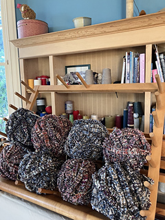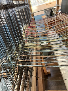 Warp for the next batch of chenille has been tied onto the loom F2B and is ready for winding.