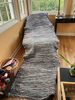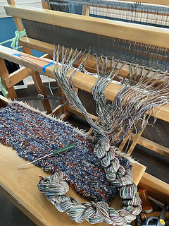 Used leftover mercerized cotton, Dance Rustic Silk, and a brown and blue rayon coned yarn as warp for the chenille. The cotton was used in a knit and crochet tee, the rustic silk was from another tee, and the brown and blue rayon was from a tabard vest that I wove early in my weaving career. Added in another spirit yarn that looks like a silk and cotton blend. So the stash busting continues!