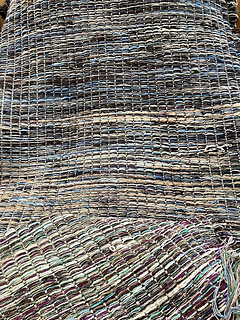 Finished weaving second set of strips on New Year’s Eve. Washed on New Year’s Day but then remembered that these old coned yarns have a petroleum smell and need to be washed in hot water and lots of soap. So washed them again yesterday and now waiting for it to dry to cut. Accidentally started cutting and then remembered I needed to wash first so there is one strip partially cut.