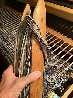 I wound the warp with two threads at a time. It was a fast wind and a fast sley, and would have been faster if I had wound the warp with four threads at a time.