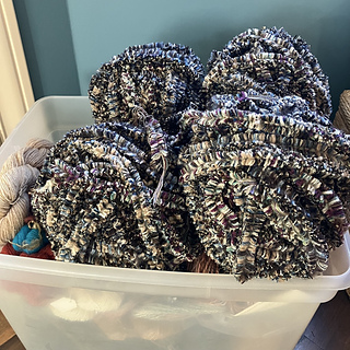 Finished cutting the chenille, part 2. I now have enough to make two rugs. Need to decide if I’ll keep the blue in one rug and the red/purple in the other or if I’ll alternate. Probably I’ll keep them separate.