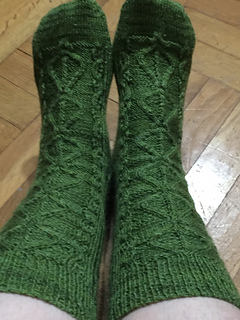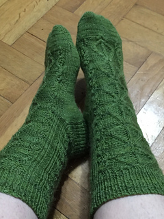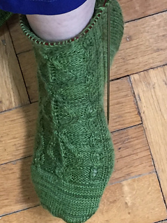 The pattern recommends a merino cashmere mix yarn. Mine contained a bit of silk and is quite slippery, in spite of the bit of mohair. This meant I had to use a cable needle - and there are many, many cables in this pattern. I lost count of the number of times I made a mistake and had to drop a cable down and work it up again. The cable panel is gorgeous, and pretty complex. So I would recommend you use a slightly “grippy” yarn. I also wouldn’t recommend this sock for a first attempt at TAAT. The tinking involved if your attention wanders slightly in that cable panel……