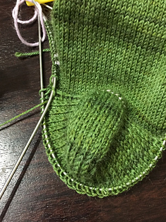 Started gusset increases on round 30 of chart, worked till 64 stitches on heel needle.