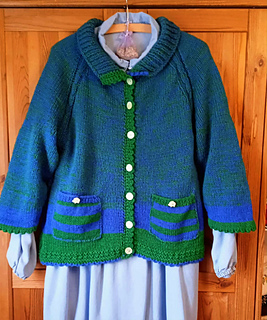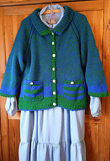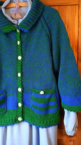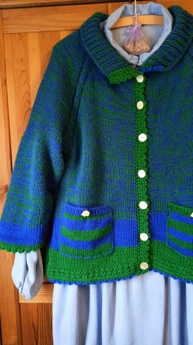 I am using two strands of YarnHome merino wool, one in green and one in Royal blue. Together this makes a super cool pattern. I am using a basic raglan, top down recipe for this project. The colar is a high one, which can be folded down or. The shape is a slight a-shape. Sleeves are worked straight down, with only slight decreases from the ellbow on. Sleeves have hems and picot detail.