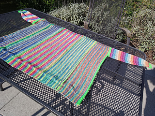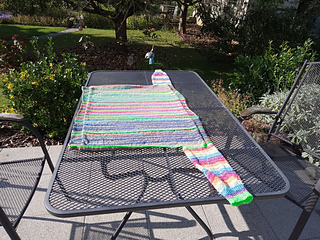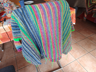 Finished first 30 ridges for the front in the rainbow colorway, now on to 30 ridges for the back.