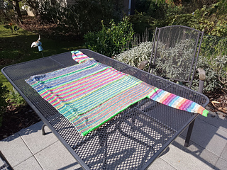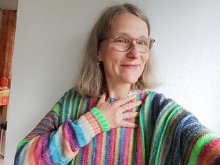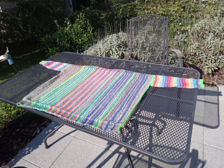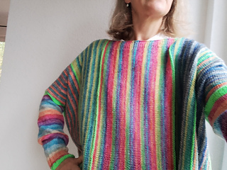 Finished rainbow middle part, had to do 37 ridges to make the slit big enough for my head. I think I might run out of the colorways I already used when I aim to do 25 ridges each again, so I decided to only do 5 ridges of them, then 15 ridges of blue-grey and 5 ridges again - we will see.