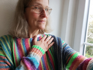 Finished last part of body, ending with 2 rows (1 ridge) in neon green. Now I plan to do a 3 needle bind-off to close the side seam, but want to do this with daylight, i.e. on the weekend.