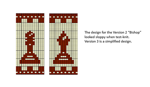 I thought through the changes I wanted for the “Bishops” chart and tried several adjustments before settling on Version 2. Originally, the “Bishops” lacked distinctness, even with their mitered caps, looking too much like “Queens” or “Pawns.” Their “shoulder caps” seemed out of character, so I started thinking about “crosiers,” the staves carried by bishops to show their roles as shepherd-leaders. My first attempts to add staves to only one side of the pieces made them unbalanced, so I settled on a hint of a “crosier” on both sides of the piece.