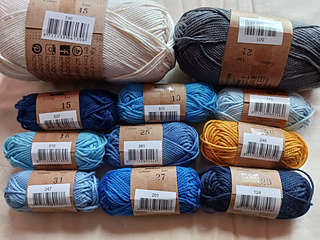 I plan to make a blanket (for me) using leftover yarn from my last project In Memory of Memaw, with the Old Lace color (cream color) as main color and some various blues of Catona as color B. The leftover Anthracite (grey) and the Saffron (a lovely gold) will be accents. The yarn picture shows the colors (too bigger skeins are leftovers) with the other color from the sampler pack I purchased a while back.