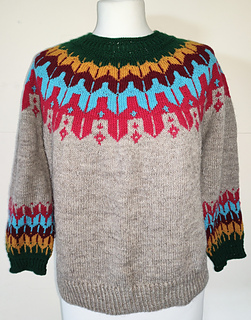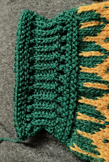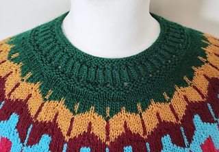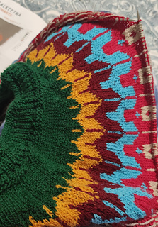 Somehow ended up with three extra stitches so had to frog back. Finished first ball of green and joined in 2nd (12g) on row 3 of yoke chart.