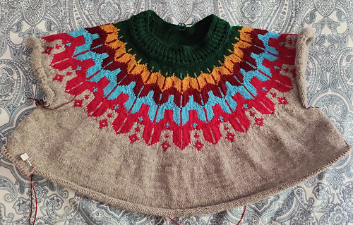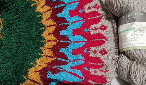 I give in. I’ve measured it again after the decreases and it’s still 148cm! I’m going to frog it back to the end of the colourwork, remove the last row of yoke increases, go down to 3.25mm needles, and also do some serious maths around the gauge to make sure I get it closer to what I need.
