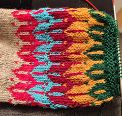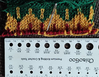The swatch measured 27 stitches on 3.5mm needles over colour work so I’m going to go up to the 6th size.
