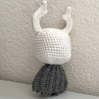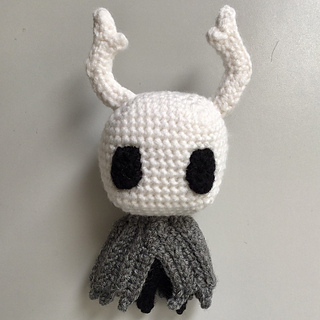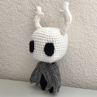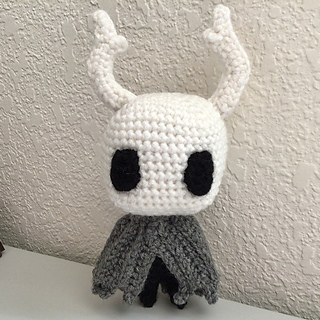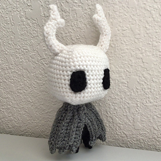 Completed a small Knight amigurumi (aka Ghost) from Hollow Knight. Crochet doll measures 7” tall (from tip of horns to feet).