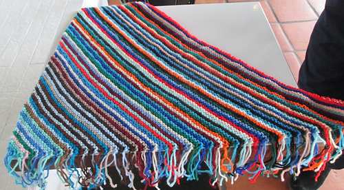 Fringes trimmed while at knitting meeting, and the top two photos are post-trimming. Done, but … despite all that knitting, my collection of leftovers doesn’t seem any smaller. ;)