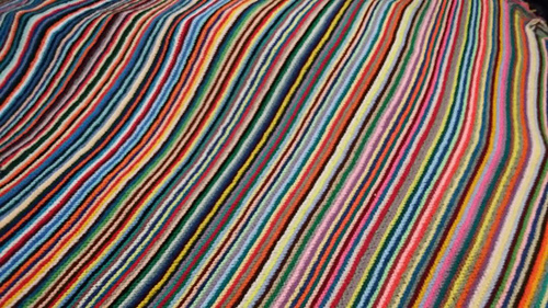278 stitches after a stripe of very thick yellow; I’ve tied a slip-knot in its fringe, just to keep track without having to count every stitch. This is the first time I had to place a stopper on one needle tip while counting, for fear of stitches popping off it. Maybe it’s time to begin decreasing? Or continue until I reach 300? It’s only 22 more rows/11 stripes.