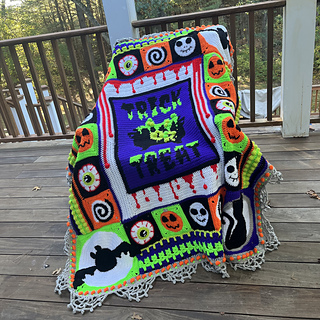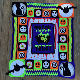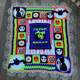 After finishing the week 1 squares, I decided the Purple and Varsity Green were too dark, and I only had one skein of the Varsity Green. I swapped out Purple for Lilac from my stash though I waffled back and forth between it and Grape. I ended up deciding I wanted the brighter color. I then went looking for a lighter green on the internet. Herrschners had Green Gecko which is very neon but I thought would be a better contrast. There’s now not quite enough contrast between the Green Gecko and the Slime, but my only alternative is Safety Yellow which is too neon and too yellow. Herrschners also had Varsity Red, which is brighter than the regular Red I had been planning to use, so I decided to swap it out too. The final blanket may be a bit eye watering, but it’s a silly, fun Halloween throw so I’m OK with that!
