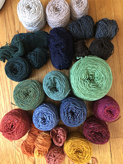 Today is the day I started thinking about this project, and went stash diving. It turns out I have a lot of single 25g skeins of Rowan yarns, and also a lot of leftover sock yarn. Don is helping with the colours.