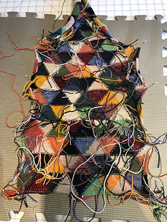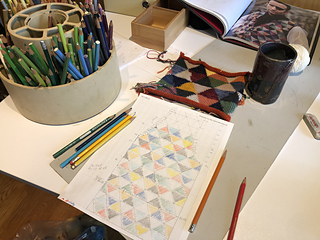 I figured this would make it easier to choose colours as I went without creating pattern repeats unintentionally. Random is harder than it seems. I’m choosing based on 2 darks, 2 hot, 2 cool colours in each group of 6 coloured triangles.