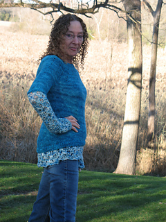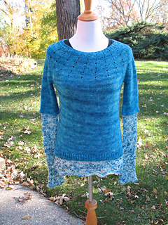 I also had been concerned that the dark teal would bleed onto the light colored lace. And rightly so! I only soaked it for about 3 minutes instead of the usual 15 before I had to pull it out, as the water was already turning blue. I had thrown a couple of dye catchers into the bath, and they already turned blue by then as well. Drying the sweater most of the way in the dryer also helped to keep the dye transfer in check, as it avoided having the dark color lying on top of the light color while soaking wet. I think that’s the way to go in the future!