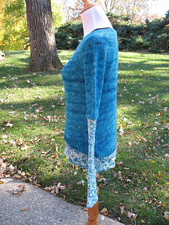 This one was actually too loose, so I backed that out too, and re-did it with the size 10 needles that the lace was knit with. This one was kind of too loose too, but not as bad as before, and better than too tight, so I decided to go with it. I think the whole thing might be too long, and the lace too loose, but it’s too late now, ‘cause I’m not going back! We’ll see how it blocks out in the end, and how it looks when I get the sleeves on.