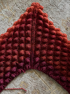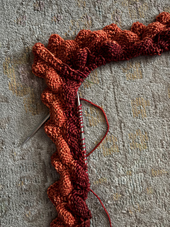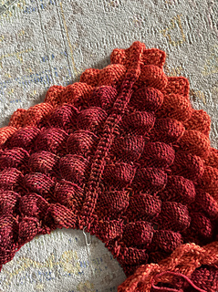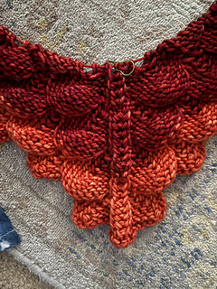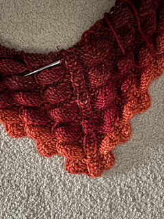 The Glazed Carrot to Libra color shift is a bit wide in actual knitting (it looked better side by side caked). The jump will have a visual effect of a border… idk, it will be ok I think. Better to jump than to stripe-in with this much color difference, especially so close to the edge. When you stripe it with a large color shift it draws the eye to the overall zigzag line of the stitch pattern instead of the scales. The zigzag stripes can work nicely deeper into the fabric and/or with more speckled colors but it is a bit jarring for me at the only an inch or so in. There wasn’t a good fitting in-between color in stock nearby and Im on a roll so going with it and hoping for the best.