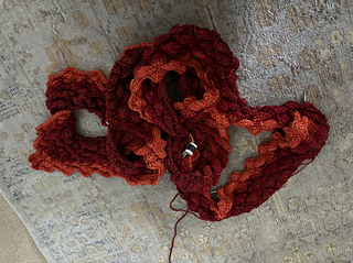 As it grows the shift is not as jarring but I do wish the orange was wider. That outer edge uses a lot of yarn! I got 10 rounds (of 12 per repeat) from 1 210y cake and I only had one. If I were to make another I’d do 3-4 balls of the outermost color aiming for roughly 3.5 repeats before starting the color shift.