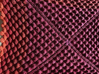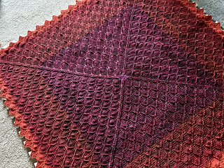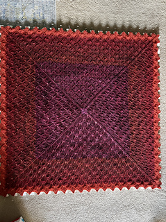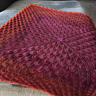 Blanket from same size scales (12x12) and layout of Harmonious. Corner miter changed slightly to a centered ICDD (double decrease) in place of the book matched singles. So scale count multiple plus 4 (not5) per side.