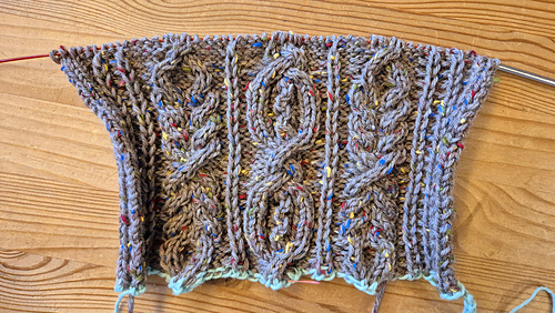 I used a crochet provisional cast on (also see link above). Since the pattern starts on a WS row, it would probably have been better to start the provisional CO on the WS too. Because I turned the crochet CO to WS to work the starting row from here, I couldn’t unzip the cast on later, but had to unpick it stitch for stitch. No problems, but quite fiddly.