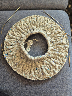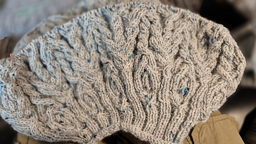 I found the the cables quite intuitive to work, though there are some heavy cabled rounds in chart A. My yarn is hard to work with, so I can’t knit too much at a time. The result is stunning, with a lovely 3D effect.