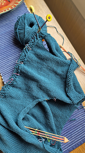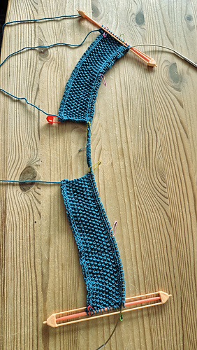 My fault: Unfortunately, I didn’t notice that one of the saddles was joined with the WS up, so I had to wing it at the hold stitches edges to get it right. The difference between the shoulders will be visible (the purl stitch is missing at the edges on the right shoulder), but truly not too much when worn.