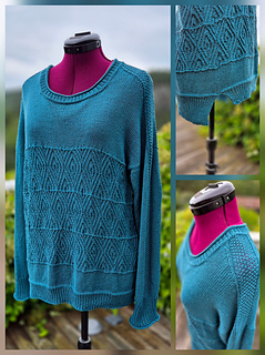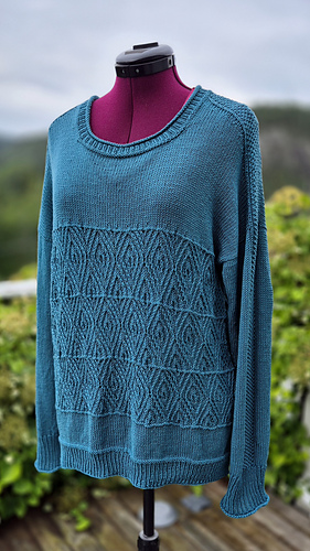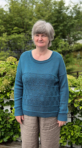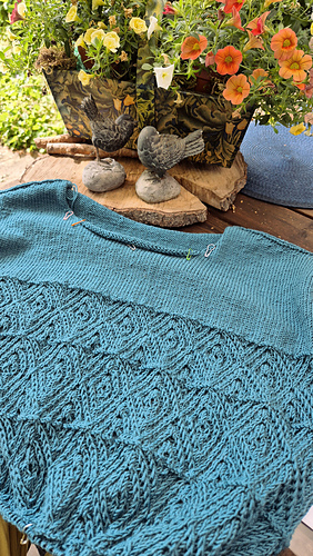 Another beautiful sweater by Irina Anikeeva which I’m testing. It has saddle shoulders and a twisted stitch pattern on the body, worked top down. The body has a decorative slipped-stitch cabling pattern.
