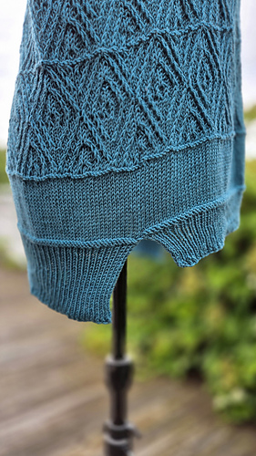 Front hem ribbing: 14 rows, then decrease row with P2tog tbl at the start and P2tog at the end (WS), Bind-off (RS).