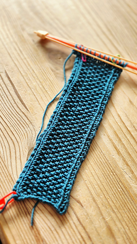 - Seed stitch saddle width 14 sts should be about 6.66 cm blocked, though the edge sts will narrow this. (10cm ÷ 23 sts × 14 sts). The inner 8 saddle seed stitches should measure 3,8 cm. When the sides sts are picked up, the saddle should measure 5 cm (armholes 15 cm x 2 + 5 = 35 cm circumference).