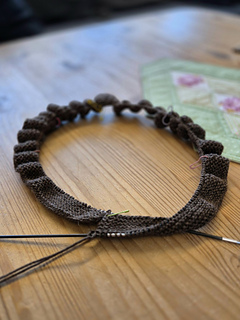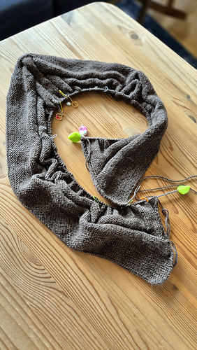 - For the frontbands, following the early test version’s suggested ratio 5:6, I picked up 5 sts out of 6 sts, unless the garter ridges where I picked up 1 st in every ridge: 138 sts total. Left: 6 (neck)+110+8+14 (hem)= 138 sts