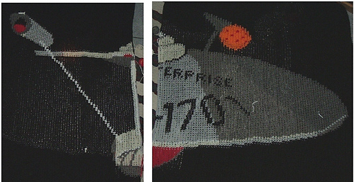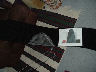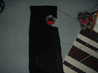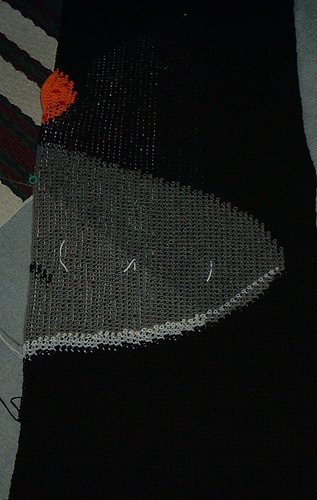 February 5: Less than a week for this section, now at 80%. As the rows get more simple, the less time it takes. Can I finish in 8 days? A lot of work to go, but it’s getting more … rote. By the time I pass 90% it’ll be almost all black. That means no switching to another color, only to switch back in three stitches. :-)