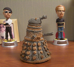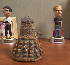 Final notes: I will get pictures up as soon as I find the card reader for my camera. I will never knit this again. It was incredibly frustrating for me--not because the pattern was bad, to the contrary. It’s just my least favorite kind of knitting, where you have to pay close attention to every single g-darn stitch. We found a heavy brass coaster around here that fit inside the Dalek perfectly, so he’s nice and heavy now--a perfect paperweight. His appendages could be a bit stiffer (snorfle), but otherwise he is the AWESOMEST DALEK THAT EVER THREATENED HUMANITY.