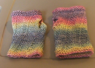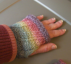 I don’t remember the needle size, which Walker pattern I cadged or what. I knit two pairs of mitts, a pair of band-style wrist warmers and a kerchief from this handspun, and then promptly lost these mitts in the bottom of a closet. Actually, they showed up in a tin. How they got there I don’t know. They’ve gotten a bit ratty and the color doesn’t really suit me, but they’re warm and rather cheerful.