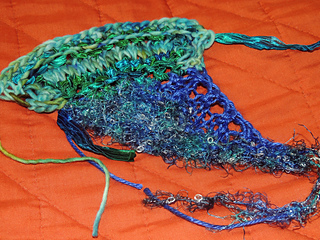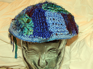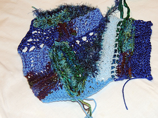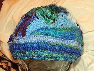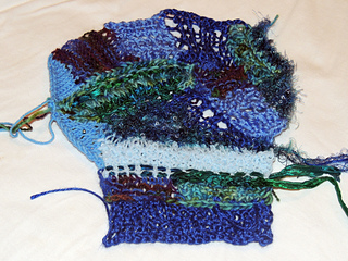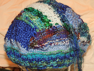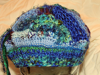 I took a large knitted scrumble, made it into a circle, then added a wide band. Except for one color, it was made from odds and ends of scrap yarns.