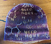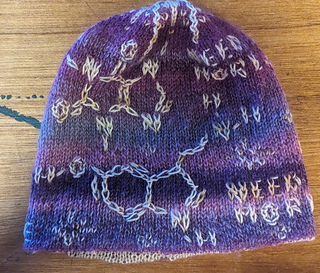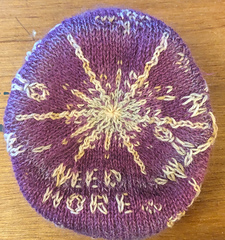 Winter hat “need more” with Christmas stars and serotonin+caffeine molecules in wedge stitch.