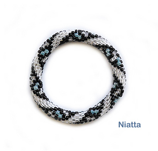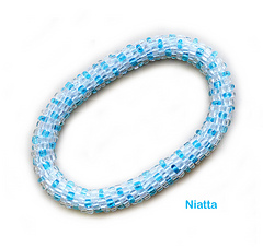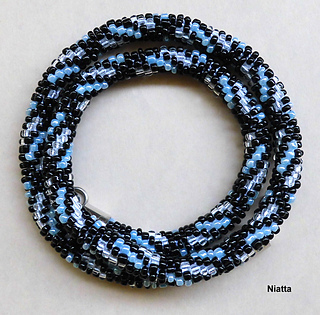 Jewelry with crochet bead rope. A collection dominated by blue color on white and black. Necklaces and bracelets that are based on my own patterns.