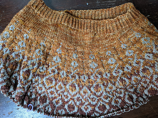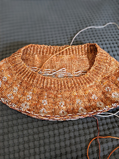 Decreased body by 28 stitches 4 inches from underarm to tighten things up a bit. I use bust measurements as a guide for my shoulder width and then generally come in a few inches after separating out the sleeves. But, I’d start these decreases immediately after the sleeve separation in the future.