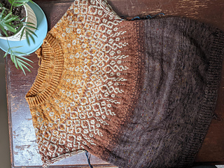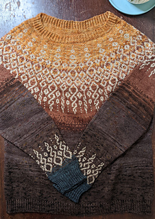 - Oh wow. Row gauge matters on this sweater a lot! The yoke is a bit deeper than I’m used to, and so the sleeves and armpits start lower than I was expecting. My row gauge was 28=4 inches, which definitely added some length as well. The colorwork was a bit tricky in some spots! However, it’s notated meticulously and beautifully in the pattern, I think I just got lost on a few occasions. It’s well worth the effort though, as it turns out beautifully. Though the gradient isn’t as soft as I originally imagined, I’m pretty happy with how it turned out. The whole piece definitely has a more relaxed fit on me, which I think is fine. I learned a ton on this project.