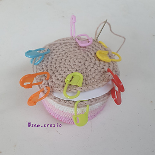 When I was sewing the biscuit base to the cylinder, I put stitch markers on every 9th st on the cylinder and a matching st marker on every 8th one on the biscuit base. That way I knew where I’d need to do an extra sewing st (2 sts in one) on the base.
