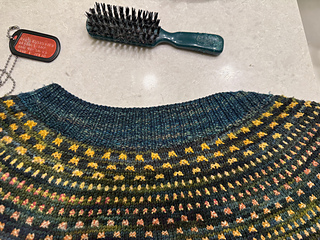 Ta-DONE! I wet-blocked the sweater with only the first sleeve done, so still need to do the other one, but this works. I'm quite pleased. I went up a full size and that helped get the shoulders to fit.