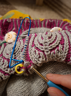 I’m probably too tired from work and all the December madness to be working on the brioche flowers. Did the decreases slanting in the wrong direction in 13 places, for which I performed some pretty complex stitch surgery. I also had to frog most of the neckband, because I misunderstood the brioche instructions and accidentally invented my own stitches.