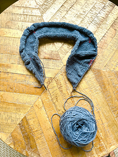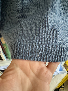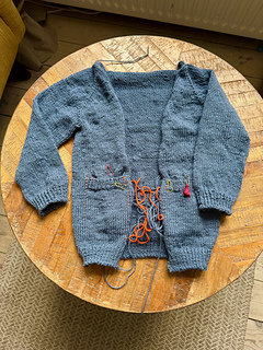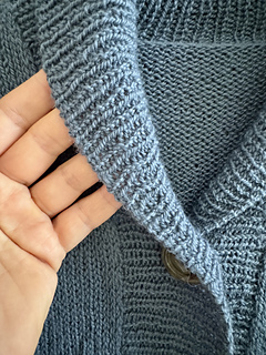 Using Cocoknits method with scrap yarn as guide for sewing down pocket linings.